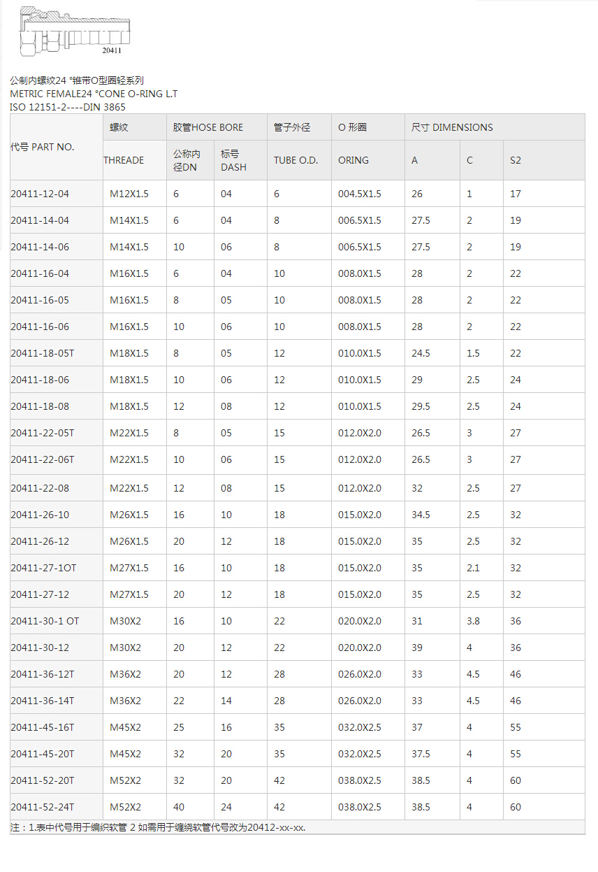 20411公制內(nèi)螺紋24°錐帶O型圈輕系列